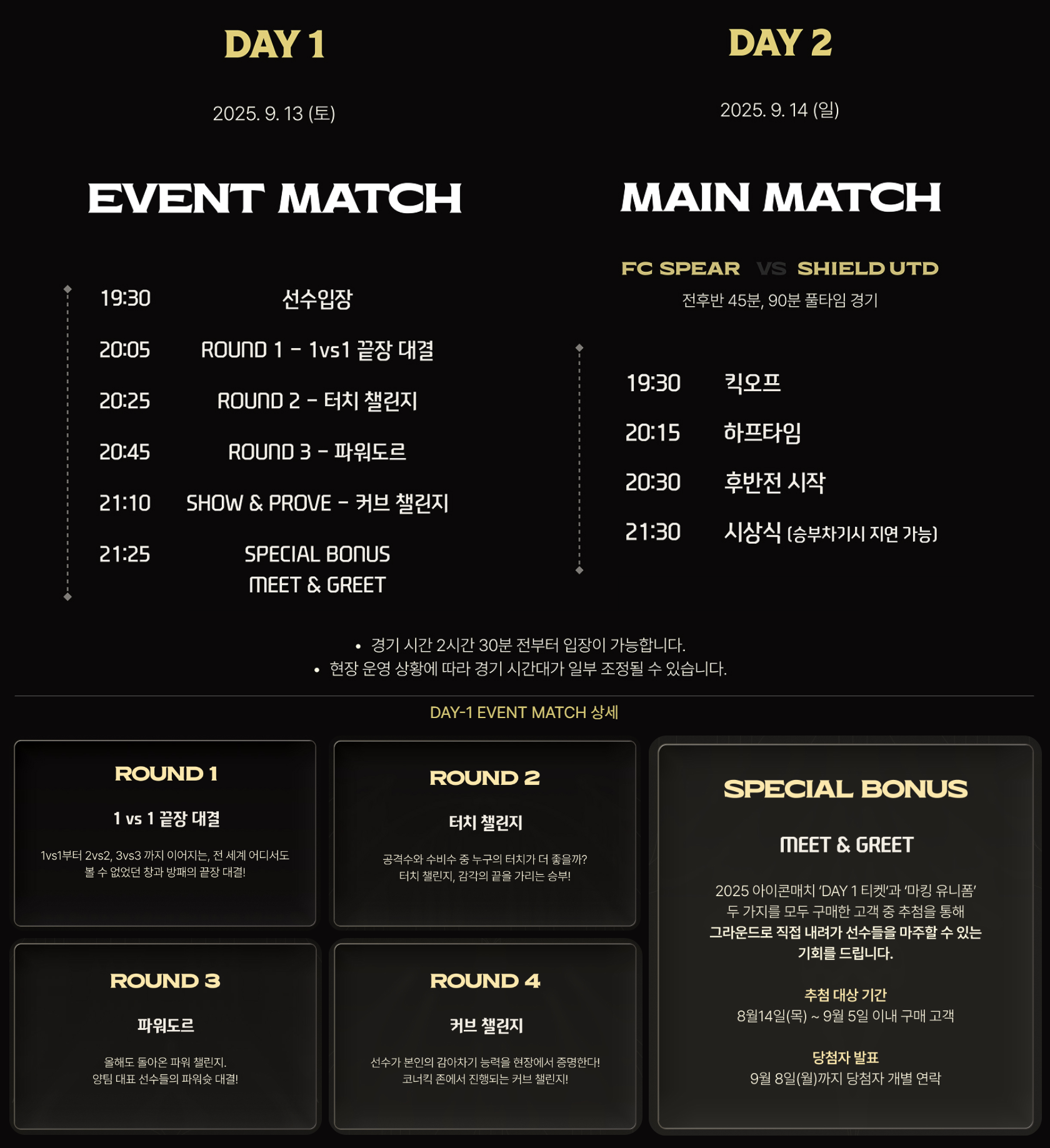 2025 아이콘 매치는 오는 2025년 9월 13일 토요일 이벤트 매치와 9월 14일 일요일 메인 매치의 일정으로, 이틀간 서울 월드컵 경기장에서 열린다. 9월 13일 토요일 이벤트 매치에서는 아이콘 매치의 전야제로 레전드 선수들이 함께하는 다양한 프로그램이 펼쳐져지는데, 이벤트 매치지만 단순한 친선 경기 이상의 의미를 가질 것으로 보인다. 9월 14일 일요일에는 본격적인 메인 매치가 진행되는데, 전후반 45분씩 총 90분 풀타임으로 치러지는 정식 경기인 FC 스피어와 쉴드 유나이티드의 치열한 이 맞대결이야 말로 아이콘 매치의 하이라이트다.