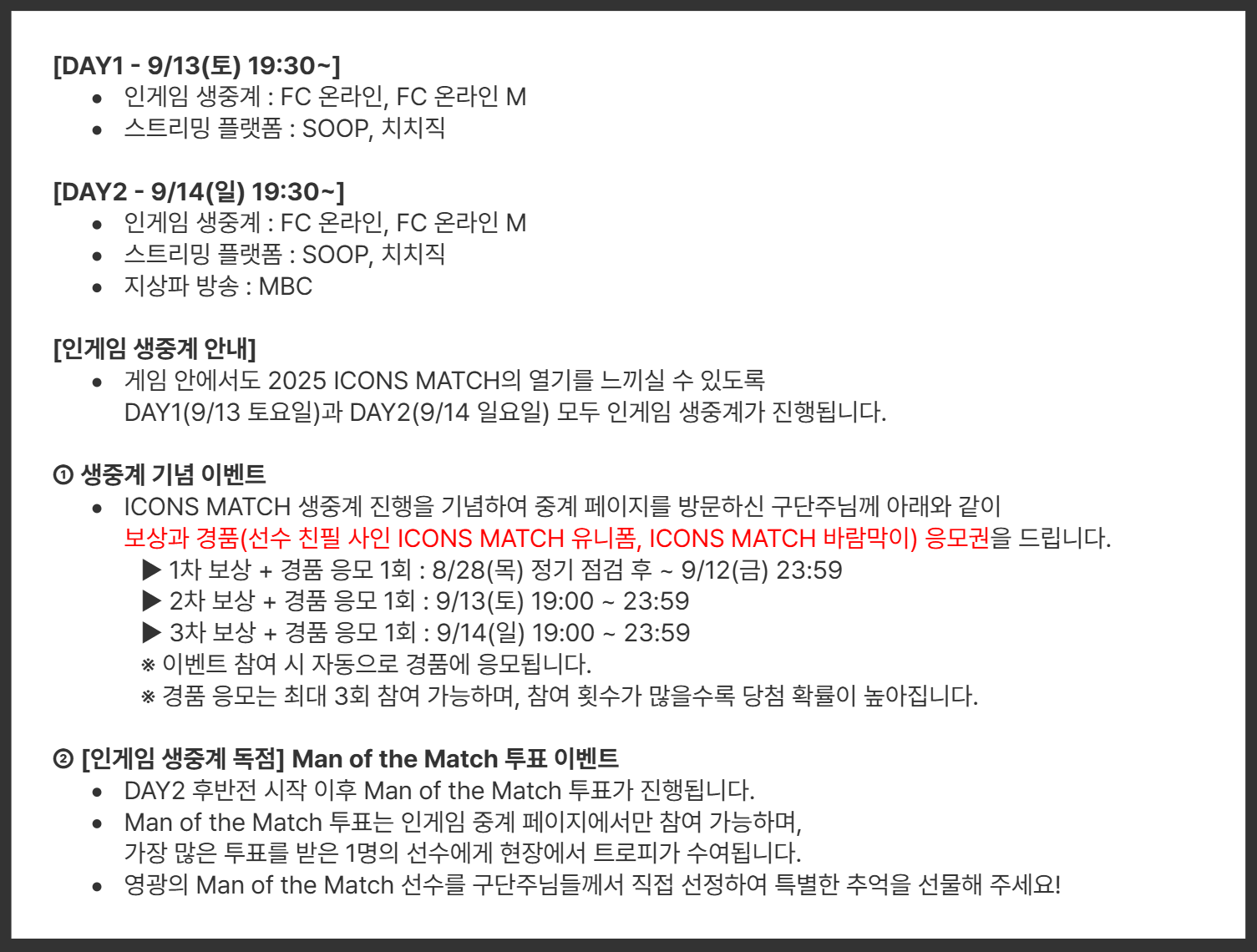 그런데 앞선 진행된 선예매(2025.8.21(목) 18:00 ~ 23:59)와 일반예매(2025.8.22(금) 18:00 ~ 소진 시 까지)에서 6만석 전석이 모두 매진되어 버려 현재로서 직관은 어렵게 되지만, 다행이도 2025 아이콘 매치의 이벤트 매치도 메인 매치도 생중계로도 관람이 가능하다. 특히나 인게임 생중계는 FC 온라인 공식 홈페이지를 통해 게임을 즐기면서 동시에 생중계 화면을 확인할 수 있는 점이 큰 특징이다. 이밖에도 SCOOP, 치지직에서도 볼 수 있으며, 특히 14일 메인 매치는 지상파 MBC를 통해서도 관람할 수 있다. 생중계 동안에는 단순히 경기 시청을 넘어 접속 보상과 경품 혜택까지 즐길 수 있으니, 직관의 아쉬움을 생중계 이벤트로 달래보자.